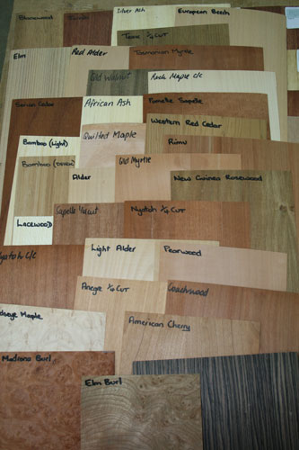 元になる木の薄板。 厚さ0.6ミリ。 模様も色もすべて自然のものです。 絵を描くとすれば絵の具に当たるんでしょうか、この模様と色をどれだけうまくつかって図案を表現するかが象嵌の醍醐味です。 日本では聞いたことの無いような木もたくさんありました。