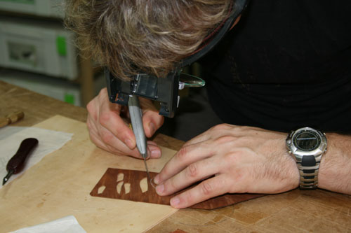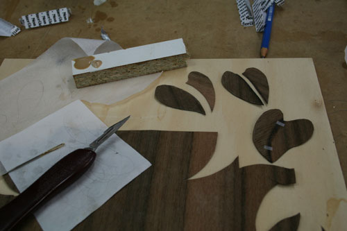 配置が決まったらナイフやノミを使って、パーツを埋め込む部分の背景のベニアをはがしていきます。
