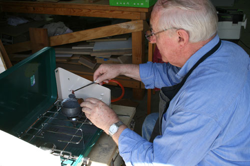 ここで使っているのはアルミの細かい砂。 十分に熱した砂をスプーンですくってその中に5秒ほどピースを漬けるとうまいこと端が焦げます。