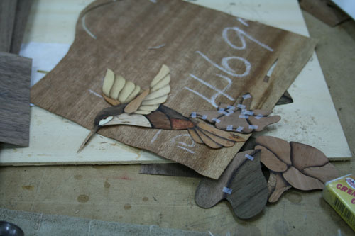 象嵌とは大雑把に言うと、薄い木の板を切り張りして絵を作る技術です。