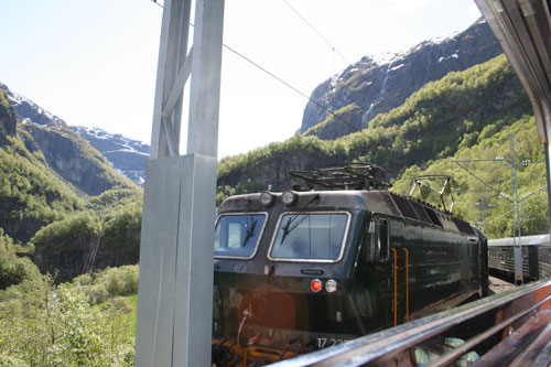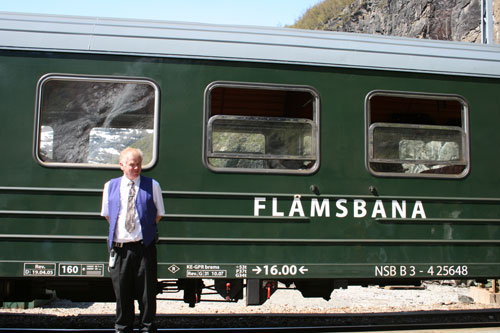 ミュダールで、鉄道マニアにも有名なフロム鉄道に乗り換えます。 深緑の外装に内側はすべて木張りのきれいな車両。 ここから約1時間かけて標高800mを一気に下ります。