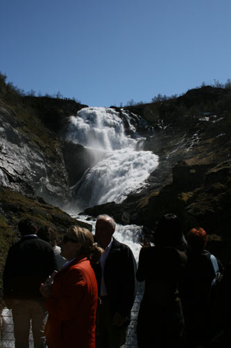 まずはユースホステルのおじさんお勧めの、近くにある滝へ。 小さな草花や白樺の木が群生する気持ちのいい山道を30分ほど登っていきます。 滝も大きくて見ごたえがあったのですが、何よりすばらしかったのがそこからの眺め! フロムの丘、昨日行ったOtterenesの村から遠くのAurlandの町までが一望できました。