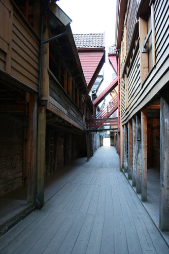 そういうわけで、朝6時起きでブリッゲン(Bryggen)を見に行きました。 ユネスコの世界遺産に登録されている、港沿いの木造家屋群です。 建物完ペキに傾いてますね・・・。