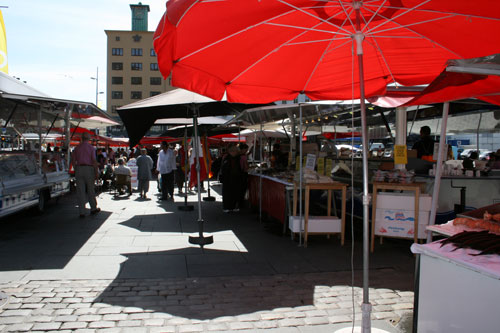 住宅街をあてもなく歩いて、お昼すぎやっと港まで戻ってきました。 有名なフィッシュマーケットはまだまだ人でいっぱい。 サーモン、かに、えび、びっくりするほど魚が山積みにされています。 ほかにも、カフェやノルディックセーターを売っているお土産屋さんなどの屋台がたくさんでていました。