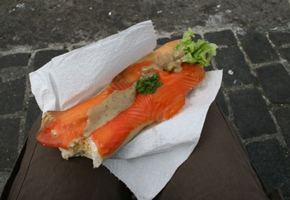 お昼はマーケットで買った作りたてのサーモン&シュリンプのバケットサンド 50kr(約1000円)。 これでもか、というぐらいサーモンが山盛りになっていて、食べ応え◎。 食べかけの写真で失礼しました。