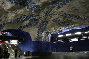 有名な、ストックホルムの地下鉄の駅。 いたるところの壁に、アート作品が描かれていました。 なかには、「これは何?」ってな超モダンから、お化け屋敷に使えそうな雰囲気ものも。でも、このブルーラインの駅が一番きれいだったかな。