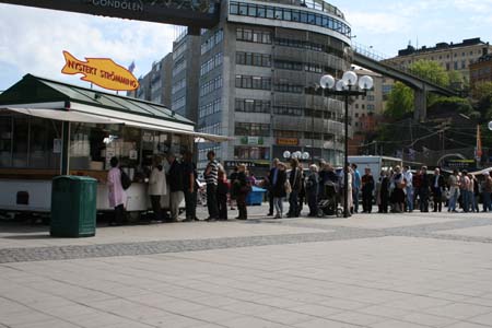 昼食は、街に戻って雑誌に載っていた、地下鉄sluseen駅の屋台へ。 地元の人に人気のお店らしく、長蛇の列です。 なんでも物価の高いスウェーデンで、初めて 「高くない!」 と思えたお店でした。