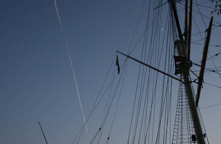 船のマスト、新月と飛行機雲。